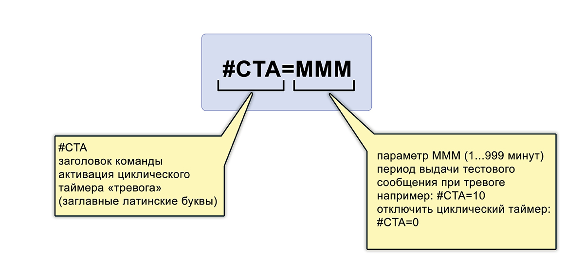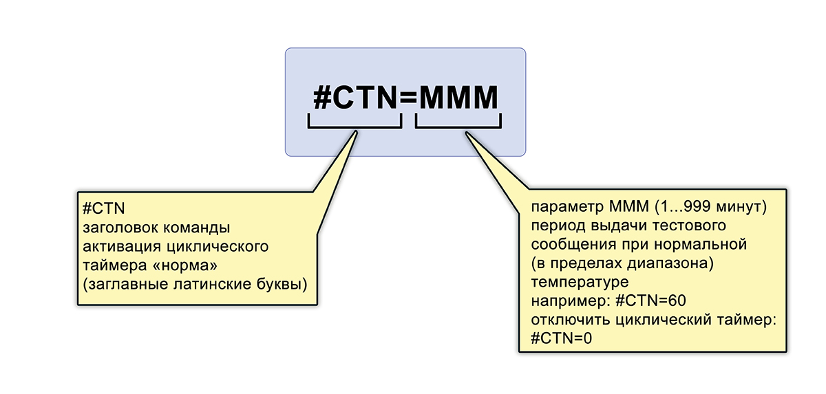 При использовании циклического таймера тестовое сообщение будет отправляться регулярно, с заданным в команде периодом. В устройстве два циклических таймера: первый для зоны температур «НОРМА» и второй для зоны температур «ТРЕВОГА». Управление таймерами идет следующими командами: