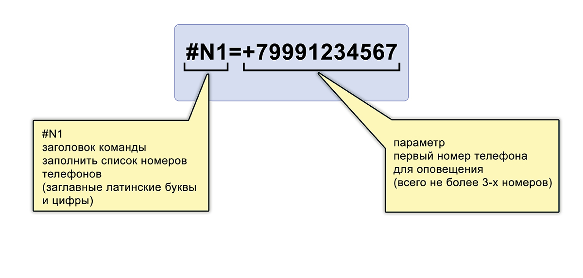 Для записи номеров (всего до 3-х номеров) в списке номеров телефонов оповещения используйте команду: