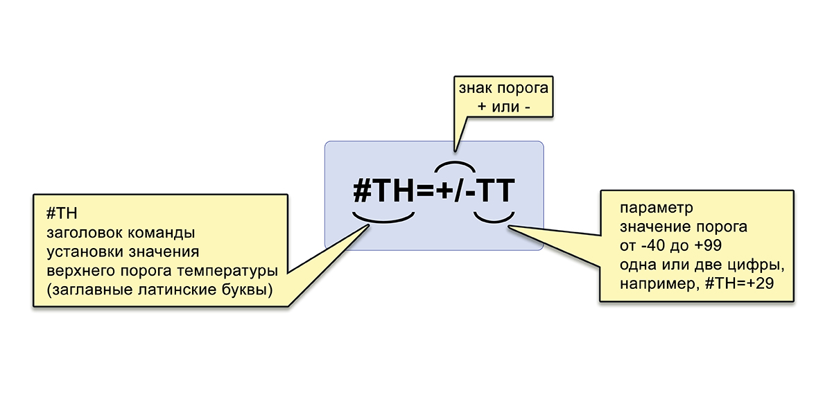 Если необходимо контролировать отрицательные значения температур, порог температуры имеет отрицательное значение, тогда команда может выглядеть, например, так: #TH=-15, или #TH=-4