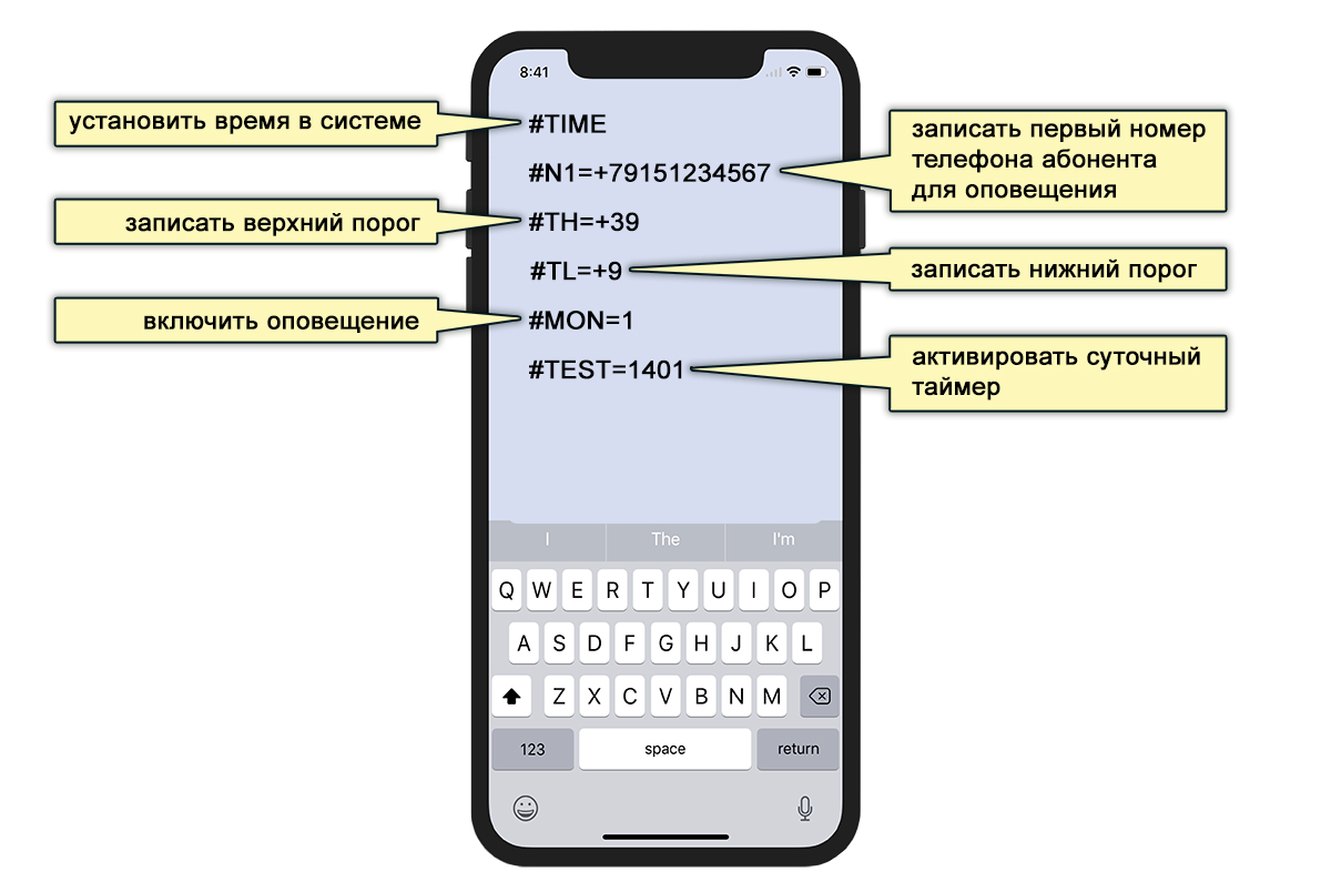 Подготовьте текст СМС сообщения с командами на экране вашего смартфона. Установите батарею в устройство, соблюдая полярность подключения, нажмите на кнопку "ПРОГРАММИРОВАНИЕ" на лицевой панели термо метра. Индикатор "GSM" начинает мигать (поиск сети GSM), вы услышите короткий звук подтверждения входа в режим. После регистрации в сети этот индикатор загорается непрерывно. Устройство готово принимать СМС сообщения с командами в течении 5 минут (далее устройство перейдет в энергосберегающий режим, и при необходимости операцию придется повторить). Отправьте подготовленное СМС сообщение с вашего смартфона на номер сим карты, которая установлена в вашем термометре. После приема и распознавания команды в сообщении устройство подтверждает операцию коротким звуком. После отправки всех необходимых команд необходимо выйти из режима программирования - для этого повторно нажмите на кнопку "ПРОГРАММИРОВАНИЕ". Индикатор "GSM" погаснет, устройство станет недоступным для приема СМС, прием команд станет невозможным. Повторный вход в режим возможен при следующем нажатии на кнопку "ПРОГРАММИРОВАНИЕ".