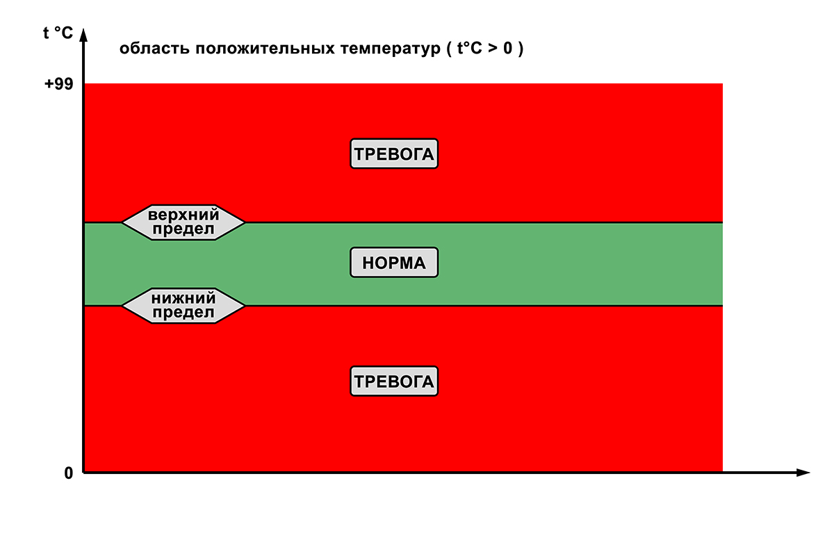 2. Выбор порогов и контроль положительных и отрицательных температур в диапазоне +99 … -40°C. Знаки приделов имеют разное значение. Верхний порог находится в положительной области, нижний порог в отрицательной.